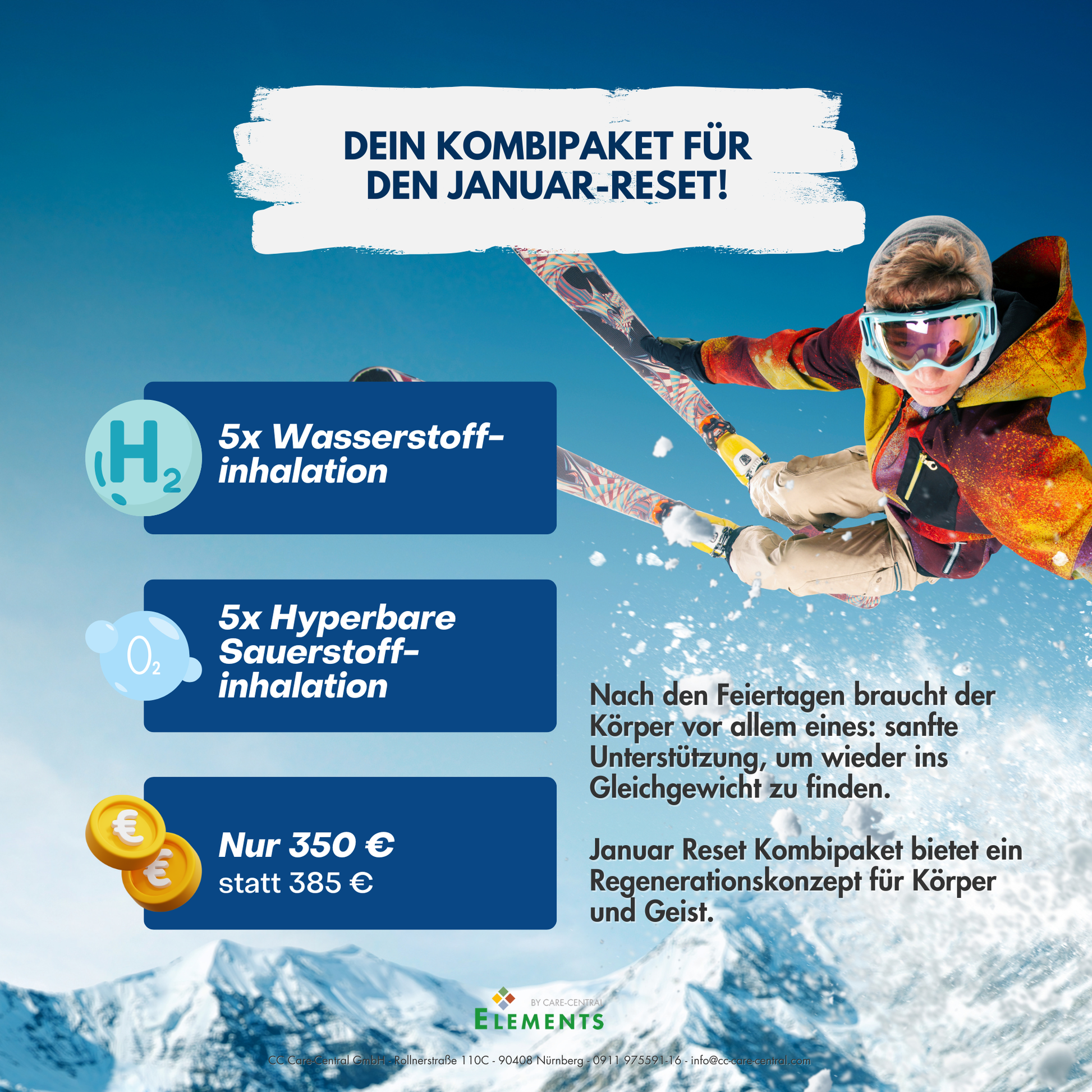 Dieses Angebot ist exklusiv im Januar im Onlineshop verfügbar, kann aber beliebig und ohne zeitliche Begrenzung vor Ort im Elements Therapiezentrum Nürnberg eingelöst werden.
