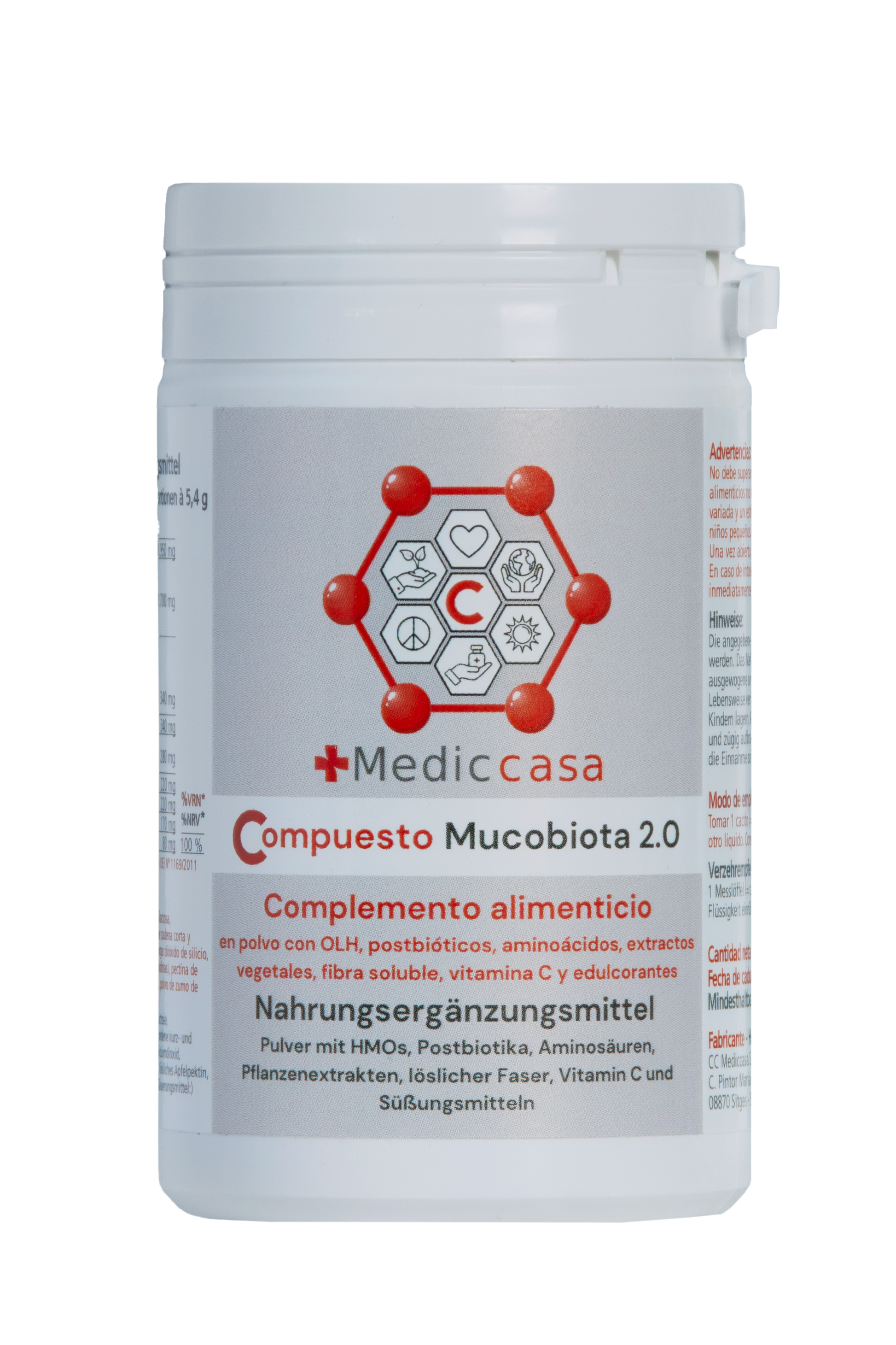 Mucobiota 2.0 ist ein Nahrungsergänzungsmittel in Pulverform mit Humanmilch-Oligosacchariden (HMOs), löslichen Ballaststoffen, N-Acetyl-D-Glucosamin, L-Threonin, Vitamin C sowie pflanzlichen Polyphenolen.